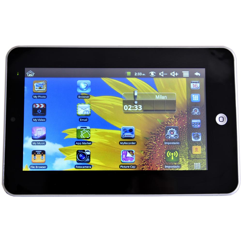 Tablet con display 7" e sistema operativo Android 2.2; Il dispositivo monta una memoria da 2 Gb espandibile fino a 32 GB e la connessione dati è assicurata dal Wi-Fi. Fotocamera di 0.3 megapixel.