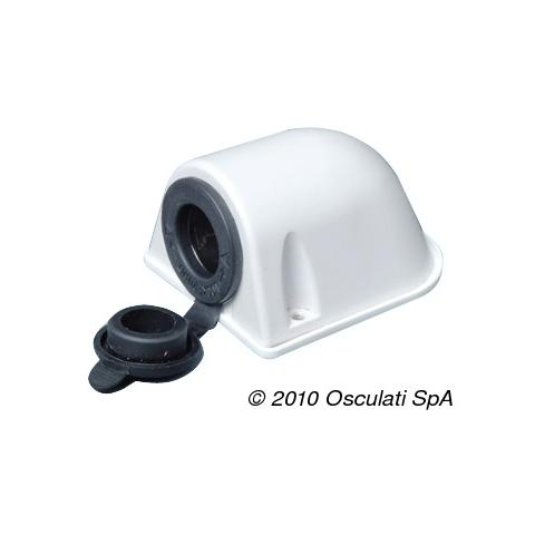 Presa di corrente. Completamente impermeabile, sia con la presa chiusa dal cappuccio in dotazione, sia quando è inserita la spina, che è dotata di uno speciale collare stagno e di un sistema "lock-in" che permette di bloccare la spina ruotandola. Completa di carenatura in plastica e guarnizione di base, per il montaggio in piano o a soffitto.