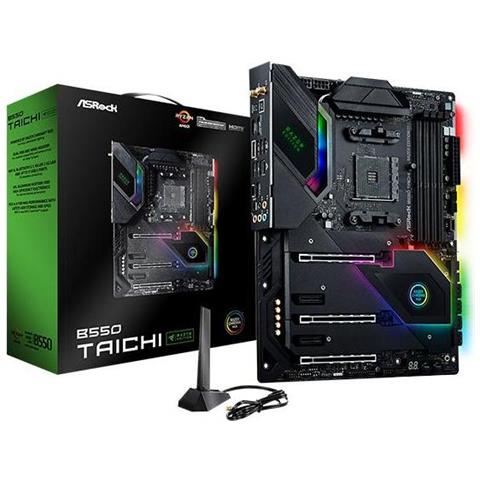 Scheda Madre B550 Taichi Razer Edition. Produttore processore: AMD, Presa per processore: Presa AM4, Processori compatibili: AMD Ryzen 3, AMD Ryzen 5, AMD Ryzen 7, 3rd Generation AMD Ryzen 9. Tipi di memoria supportati: DDR4-SDRAM, RAM massima supportata: 128 GB, tipo di slot di memoria: DIMM. Interfacce dell'unità di archiviazione supportate: SATA III, Tipi di unità di archiviazione supportate...