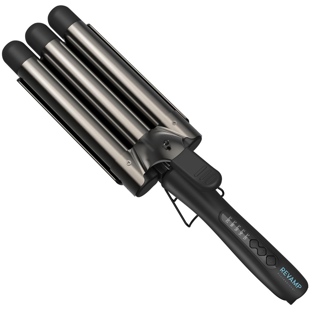 Revamp Styler Arricciacapelli Progloss Deep Beach Waver. Tipo: Piastra texturizzante, Tecnologia: Caldo, Tipo di controllo: Pulsanti. Colore del prodotto: Nero. Lunghezza cavo: 3 m, Spegnimento automatico dopo: 60 min. Alimentazione: AC. Colore cavo: Nero