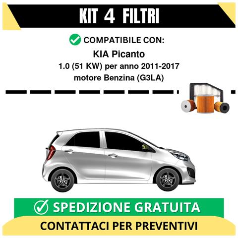 Kit filtri completo per kia picanto 1.0 51 kw benzina 2011-2017. Il kit include: filtro olio, filtro aria, filtro abitacolo. Il kit non comprende l'olio motore, ma può essere aggiunto su richiesta contattando il servizio clienti. I marchi dei filtri vengono selezionati al momento della spedizione in base alle giacenze di magazzino e possono variare; non è possibile conoscerli in anticipo tratta...