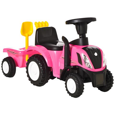 Trattore Per Bambini Cavalcabile Con Rimorchio, Rastrello E Pala, Gioco Educativo Per Bimbi 12-36 Mesi, 91x29x44cm, Rosa