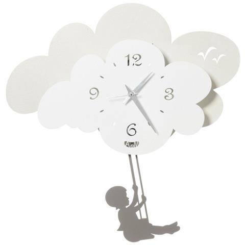 L? orologio da parete Nuvola a pendolo ? composto da due nuvole sovrapposte e un? altalena appesa ad esse. Il bambino che dondola rappresenta il pendolo. Dimensione: 35x3Px35H Materiale: ferro