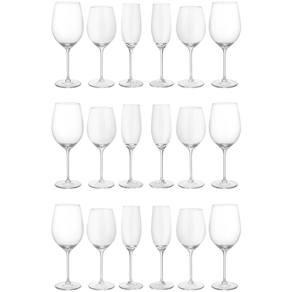 Questo servizio da 18 calici è pensato per 6 persone e contiene calici e flute per ogni occasione, in modo tale che tu abbia sempre il giusto calice da utilizzare per vini rossi o bianchi, spumanti e champagne. Il set include: 6 flute diametro 6,8 cm, altezza 23 cm, 6 calici vino rosso diametro 8 cm, altezza 22,3 cm, 6 calici vino bianco diametro 8,5 cm, altezza 23,5 cm. Tutti i calici sono lav...