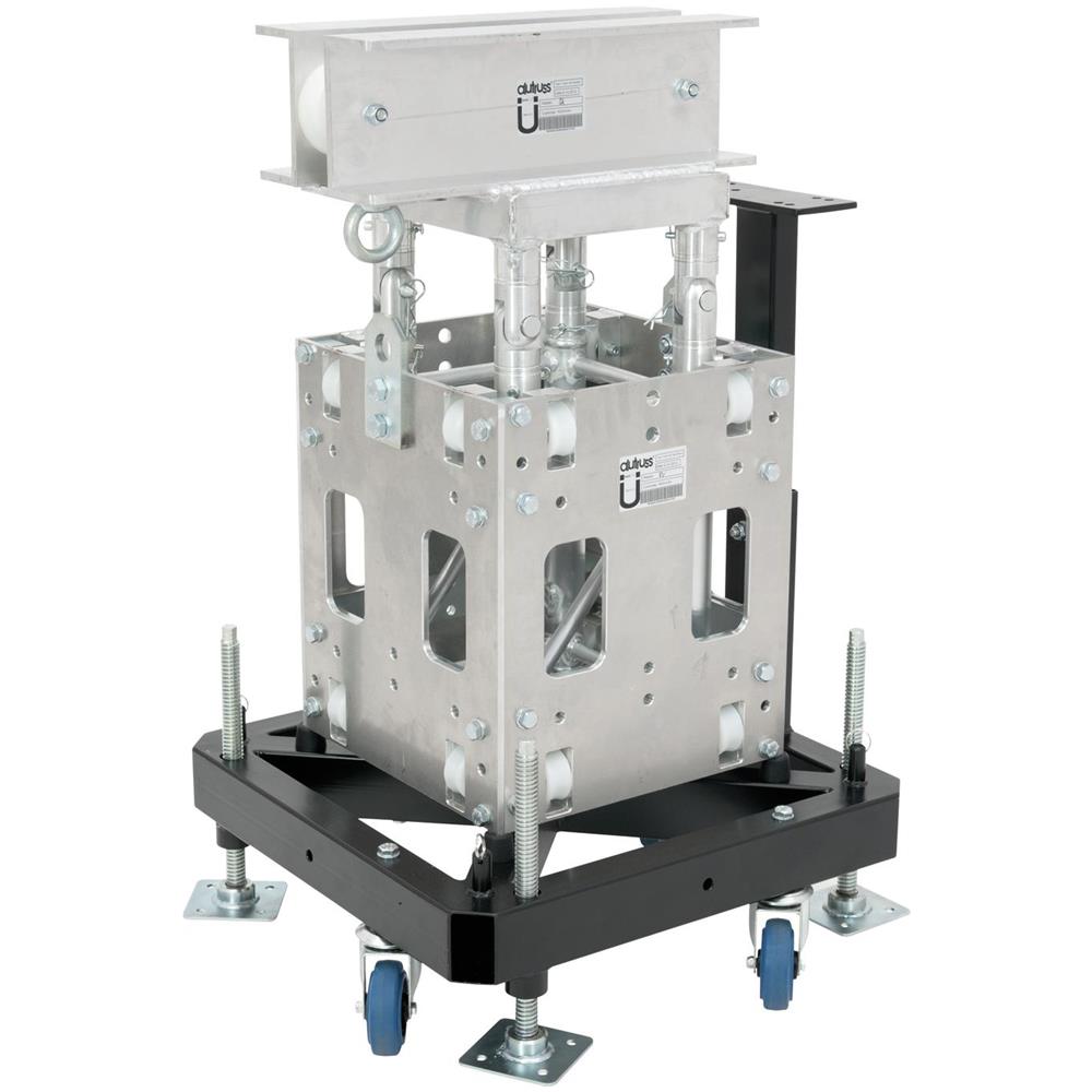 4-point trussing tower complete set high quality workmanship for maximum security easy installation for building ground supports with at least 4 towers set consists of: 1 x alutruss tower base 1 x alutruss tower corner block 1 x alutruss tower sleeve block 4 x alutruss tower hinge 1 x towertruss tqtr-500 delivery without handwinch and steelrope trusspipe: 50 mm made in europe color: alu colored...