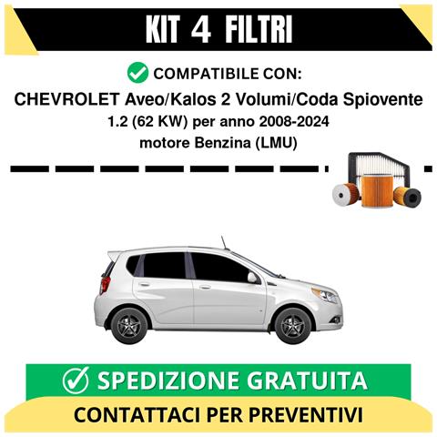 Kit filtri completo per chevrolet aveo/kalos 2 volumi/coda spiovente 1.2 62 kw benzina 2008-2024. Il kit include: filtro olio, filtro carburante, filtro aria, filtro abitacolo. Il kit non comprende l'olio motore, ma può essere aggiunto su richiesta contattando il servizio clienti. I marchi dei filtri vengono selezionati al momento della spedizione in base alle giacenze di magazzino e possono va...