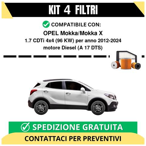 Kit filtri completo per opel mokka/mokka x 1.7 cdti 4x4 96 kw diesel 2012-2024. Il kit include: filtro olio, filtro carburante, filtro aria, filtro abitacolo. Il kit non comprende l'olio motore, ma può essere aggiunto su richiesta contattando il servizio clienti. I marchi dei filtri vengono selezionati al momento della spedizione in base alle giacenze di magazzino e possono variare; non è possi...