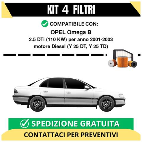 Kit filtri completo per opel omega b 2.5 dti 110 kw diesel 2001-2003. Il kit include: filtro olio, filtro carburante, filtro aria, filtro abitacolo. Il kit non comprende l'olio motore, ma può essere aggiunto su richiesta contattando il servizio clienti. I marchi dei filtri vengono selezionati al momento della spedizione in base alle giacenze di magazzino e possono variare; non è possibile conos...