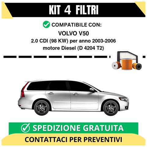 Kit filtri completo per volvo v50 2.0 cdi 98 kw diesel 2003-2006. Il kit include: filtro olio, filtro carburante, filtro aria, filtro abitacolo. Il kit non comprende l'olio motore, ma può essere aggiunto su richiesta contattando il servizio clienti. I marchi dei filtri vengono selezionati al momento della spedizione in base alle giacenze di magazzino e possono variare; non è possibile conoscerl...