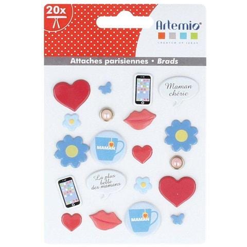 20 chiusure metalliche parigine sul tema della festa della mamma, che misurano da 0,8 cm a 2,2 cm.rappresentano cuori, telefoni, bocche, fiori nei toni del rosso e del blu.ideale per tutte le tue opere di scrapbooking e cartone, le cravatte parigine sono composte da una testa e due linguette.consentono di fissare elementi tra di loro e aggiungere elementi rotanti, ma sono anche abbellimenti a p...