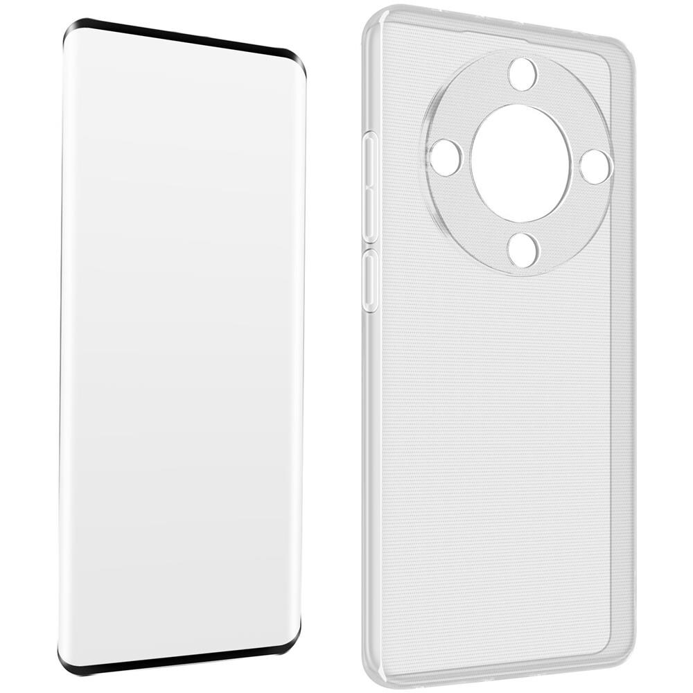 Kit protettivo per honor magic 5 lite 5g. La cover trasparente in silicone protegge da urti e graffi, lasciando visibile il design del telefono. Il vetro temperato 9h con bordo nero è ultra-resistente. Le funzionalità sono inalterate.