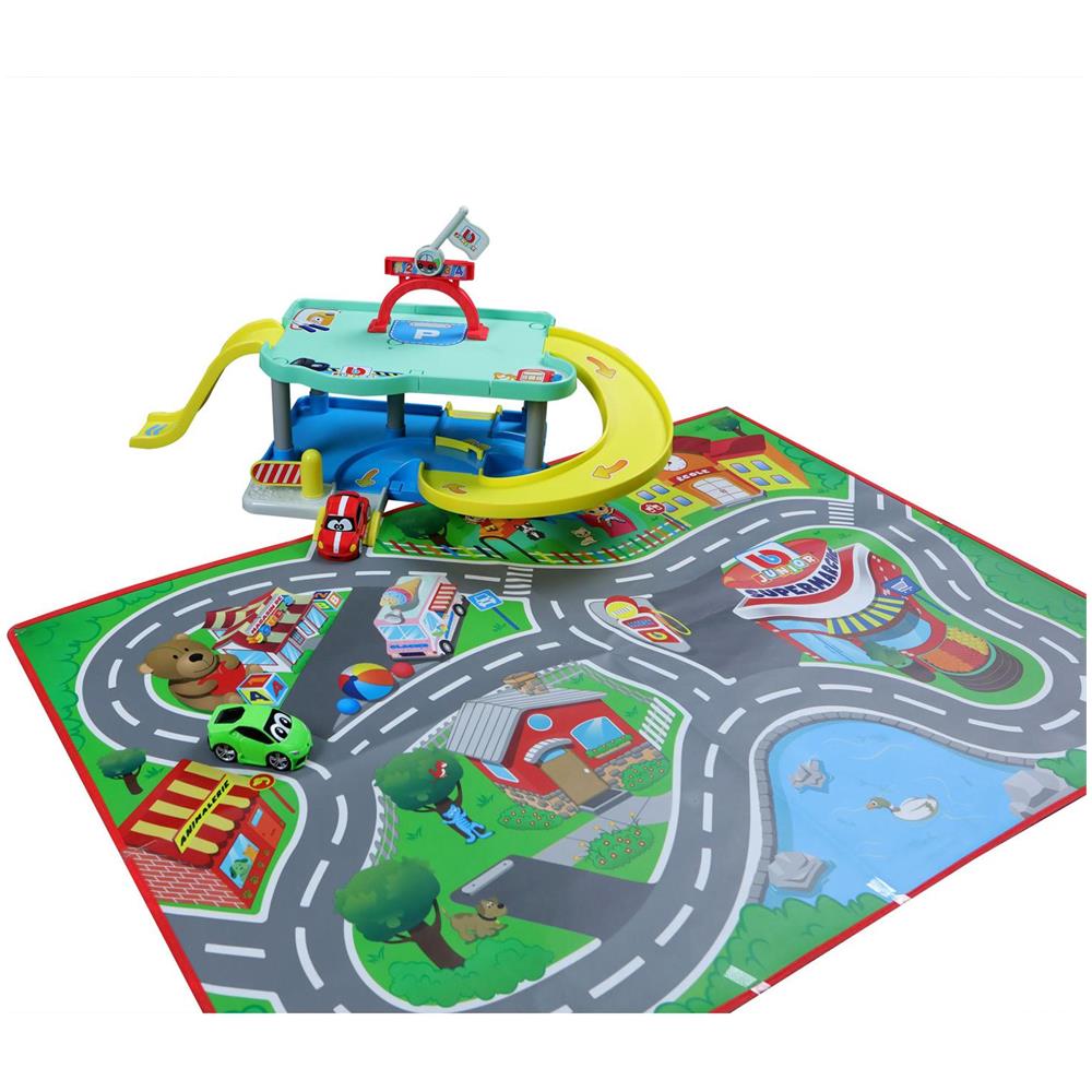 Dai ispirazione a tanti giochi fantasiosi con parcheggi e tappetini. dalle due rampe del parcheggio le auto atterrano sulla strada e sono pronte a proseguire in nuove avventure. il garage è grande 67 x 37 x 32 cm e viene fornito con un tappetino da gioco 100 x 70 cm e 2 auto da 9 cm, un maggiolino vw e una lamborghini huracan coupé. - età: dai 12 mesi.