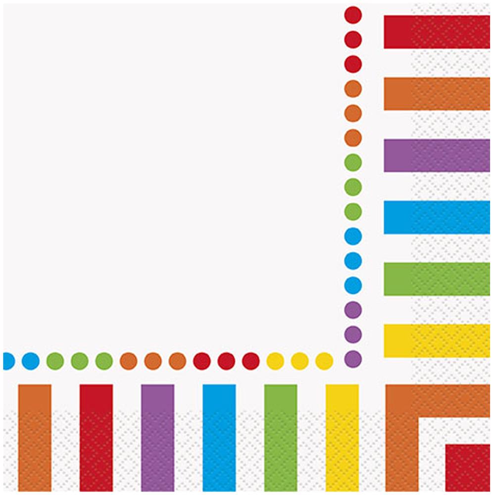 Questo set contiene 16 tovaglioli in carta, perfetti per portare colore ad ogni buffet. I tovaglioli misurano cm 16,5 x 16,5 piegati, e cm 33 x 33 aperti. Sono realizzati in carta bianca e decorati lateralmente con tante strisce colorate ed allegri pois. Saranno perfetti da unire ad altri simpaticissimi addobbi per feste di compleanno, oppure per accompagnare salatini e pizzette in occasione di...