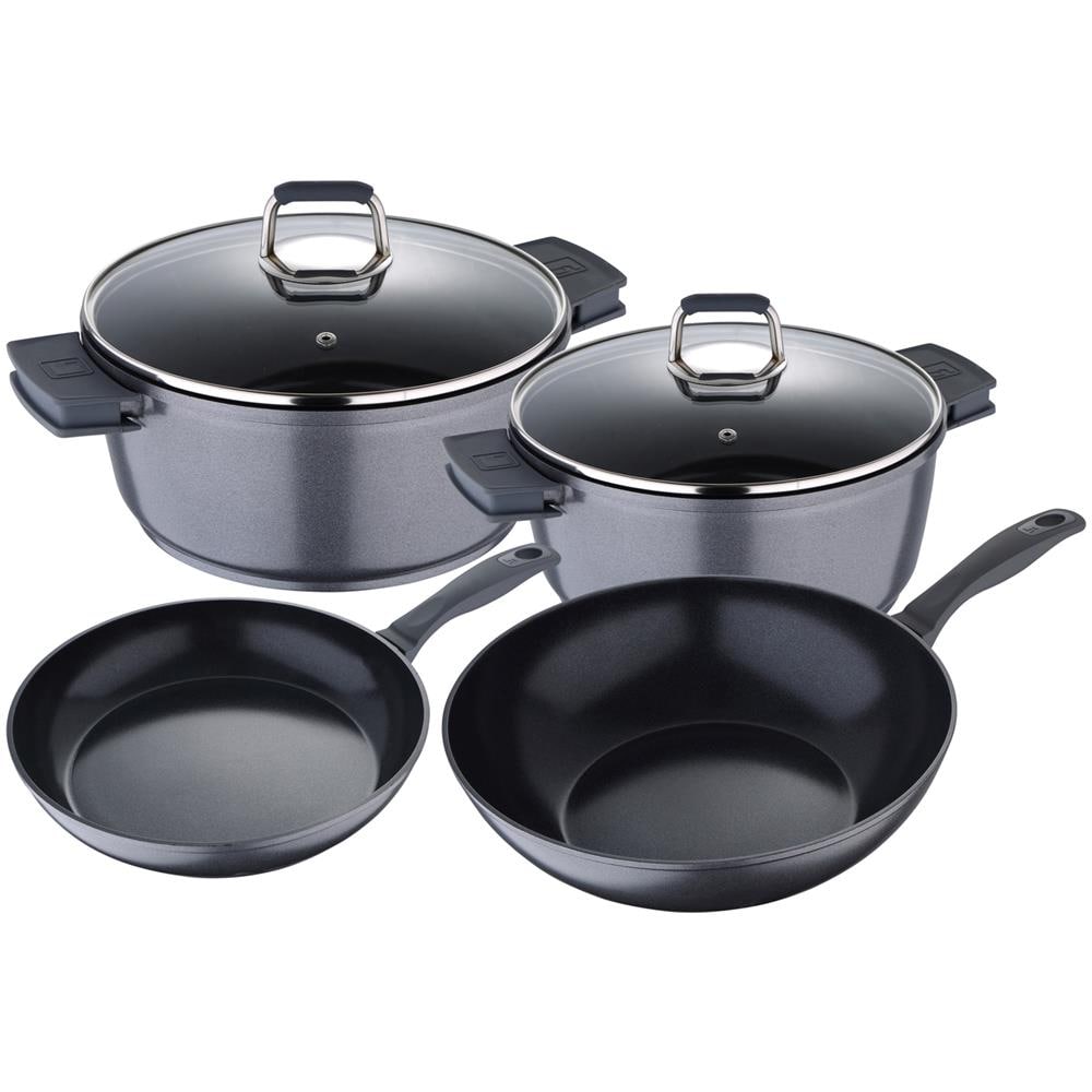 Batteria da cucina a 6 parti della collezione titan, realizzata in alluminio fuso nelle padelle e alluminio forgiato in padelle. l'interno ha una fodera non percorrente nel rivestimento in titanio di fusione nera di whitford e l'esterno è grigio chiaro, in un'elegante combinazione di colori. le maniglie, i manghi e le palpebre sono di tocco morbido e hanno un inserimento in silicone per facilit...
