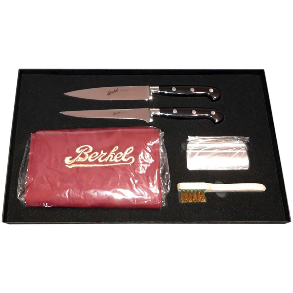 SALUMIERE ESSENTIAL KIT - ADHOC comprende: 16 cm coltello cucina Adhoc Nero Lucido, 16 cm coltello disosso Adhoc Nero Lucido, Pinza prosciutto, Grembiule rosso, Spazzola pulisci smerigli. il Peso complessivo è di 0.5 kg. Il Materiale della lama è acciaio Inox 1.4034 X46 Cr 13, Durezza Dopo T. T: 53-54 HRC, Carta Good, Rivetti in Acciaio AISI 303, Impugnatura composta da guancette in resina asse...
