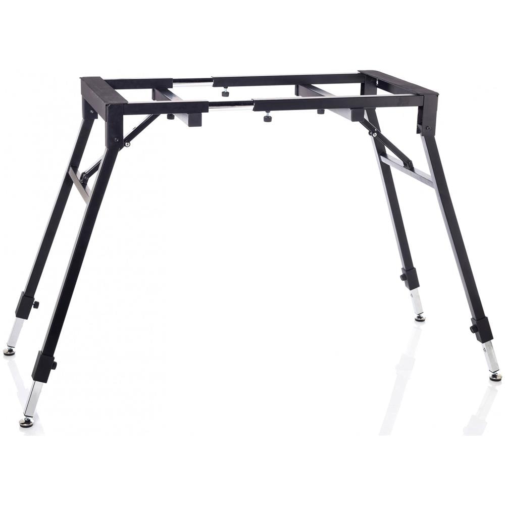 Supporto professionale in acciaio a 4 gambe per tastiera. Completamente regolabile in altezza e larghezza. Totalmente richiudibile. Apertura delle gambe con blocco di sicurezza. Gambe cromate con manopole per la regolazione e piedini rotanti autolivellanti.