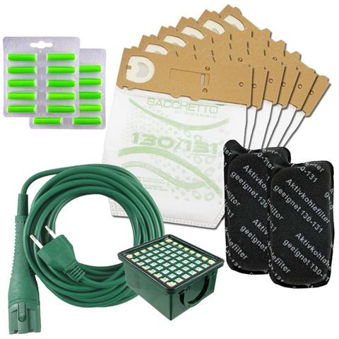 N. 12 sacchetti in microfibra + 20 profumi + 1 filtro hepa + 2 filtro carboni attivi + 1 cavo alimentazione 10 mt per folletto 130-131. Prodotti compatibili di qualità superiore garantita. Kit consumabili per 1 anno: sostituzione filtro hepa 1 volta l'anno, sostituzione filtro carboni ogni 6 mesi.