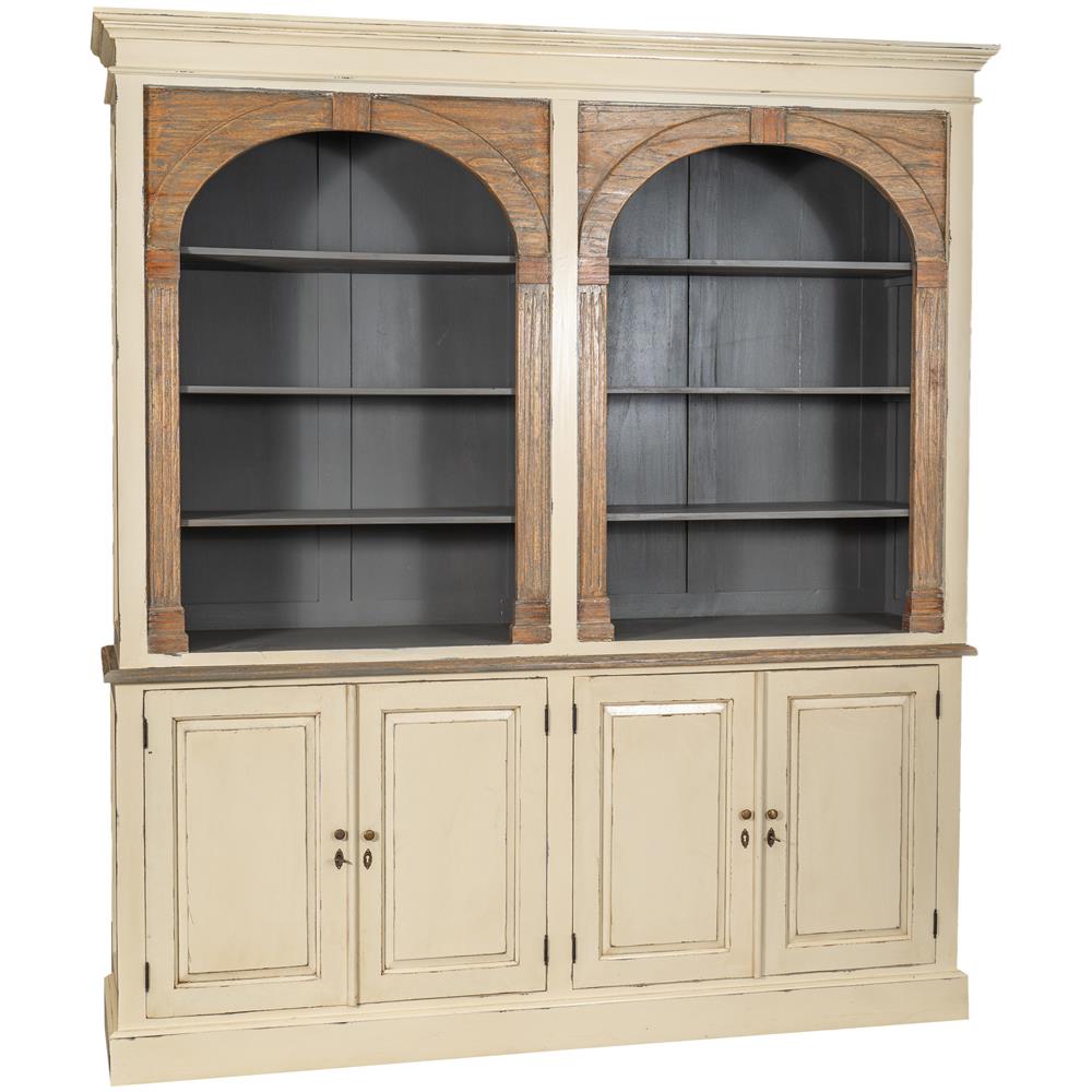 Spaziosa e molto robusta libreria totalmente in legno massello di mogano e rovere in finitura bianco anticato di dimensioni lunghezza 205 cm, profondità 49 cm, altezza 230 cm. Può essere anche utilizzata come vetrina, espositore donando un tocco di stile country e shabby a qualsiasi ambiente.