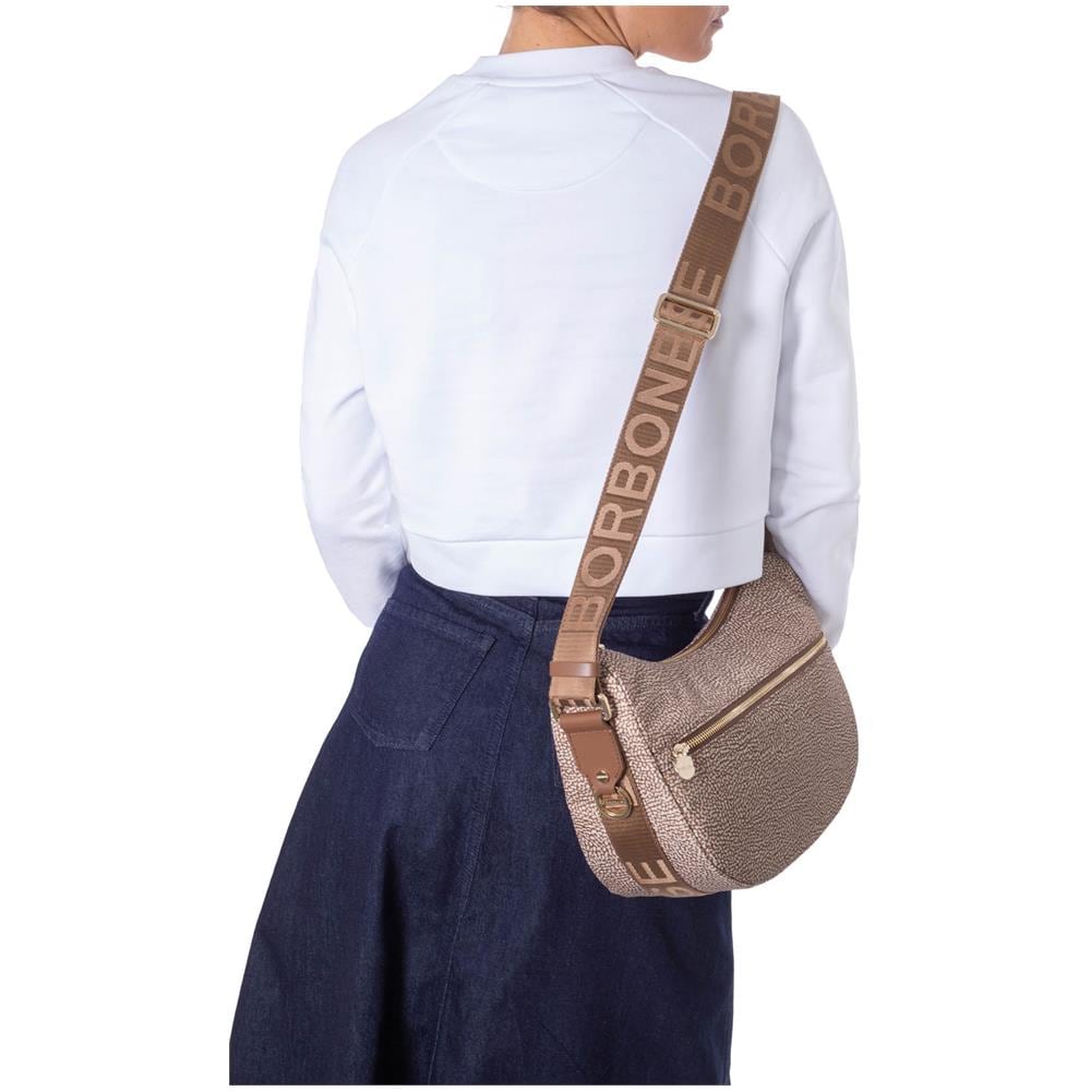 Iconica borsa luna piccola, in versione ecosostenibile, in nylon jet op beige, riciclato da bottiglie in plastica, con dettagli in pelle e finiture in tonalità e tiralampo a forma di vite stilizzata. - scomparto principale con zip, interno foderato in tessuto jacquard, con tasche e targhetta logo borbonese stampato a fuoco- tasca esterna laterale con zip- tracolla regolabile in nastro di nylon ...