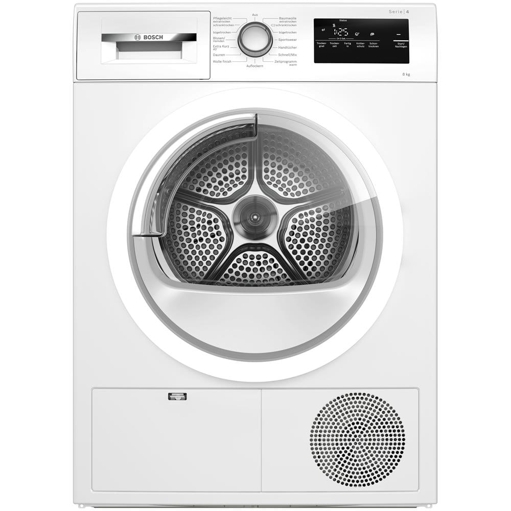 Bosch Serie 4 Asciugatrice a pompa di calore, 8 kg, Cl. A++, con filtro EasyClean. Posizionamento dell'apparecchio: Libera installazione, Tipo di carica: Caricamento frontale, Sistema di asciugatura: Pompa di calore. Capacità cestello: 8 kg, Classe efficacia di asciugatura: B, Programmi di asciugatura: Camicia /maglietta, Cotone, Delicati /Seta, Piumino /piumone, Mix, Rapido, Sport, Sintetico,....