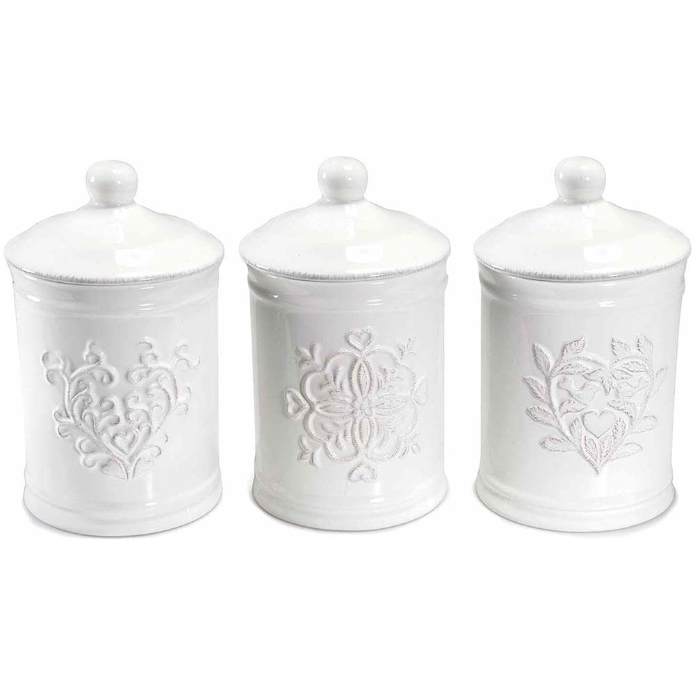 Un set composto da tre barattoli in ceramica con coperchio. Sulla parte frontale ciascun barattolo riporta una diversa decorazione in rilievo. Misurano 11,5 centimetri di diametro e 19 centimetri di altezza. Possibili utilizzi del prodotto: contenitore per alimenti come caff? , sale, zucchero e dolciumi; bomboniera per ricorrenze; complemento d'arredo shabby chic per la cucina.