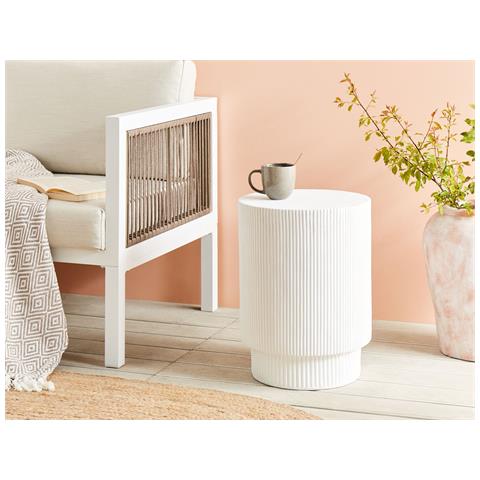 Tavolino a costine. Questo tavolino, versatile sia per gli spazi interni che per quelli esterni, presenta un design con superficie scanalata che aggiunge interesse visivo e consistenza a qualsiasi ambiente. Realizzato in resistente ossido di magnesio, ha un'eccezionale resistenza all'usura, che lo rende adatto a una varietà di ambienti. Con il suo aspetto in pietra, questo tavolino si integra p...