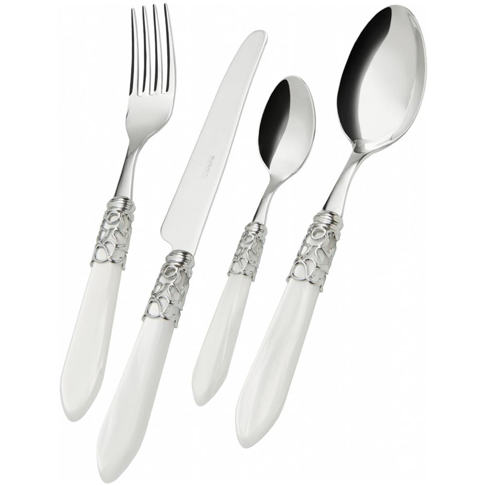 Set 24 pezzi confezionato in scatola gallery, colorazione del manico madreperla con finitura della ghiera cromata. il set 24 pezzi è composto da: 6 cucchiai da tavola 6 forchette da tavola 6 coltelli da tavola 6 cucchiaini caffè materiale: acciaio inossidabile 18/10, acrilico, ghiera cromata finitura: colore con effetto madreperla.