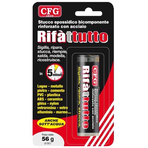 Bicomponente epossidico rinforzato con acciaio per uso universale. sigilla, modella, incolla, ricostruisce, ripara, riempie, stucca, salda anche sott’acqua, in pochi minuti: legno, pietra, plastica, metallo, pvc, abs, cemento, ceramica, vetro, ghisa, vetroresina, alluminio, nylon, marmo… stucco epossidico bicomponente rinforzato con metallo. Semplicissimo da usare grazie al predosaggio dei co...