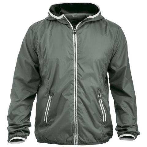 Windbreaker leggero con cappuccio. Profili a contrasto. Cerniere decorative metallic-look. Fondo con coulisse elastica. Fodera morbida in rete con apertura per agevolare stampe e ricami.