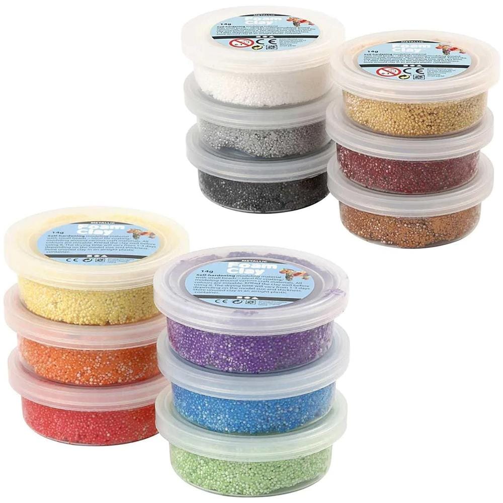 2 set di pasta metallico metallico in schiuma clay® - 12 colori x 14 g. Con questi 12 paste metalliche di 12 modelli in schiuma clay®, il più giovane (da 3 anni) apprezzeranno la modellazione, la scultura, la creazione di forme 3d o decorazioni piatte. L'impasto leggero contiene palline micro polistirolo, è applicabile su legno, plastica o metallo. Il vantaggio dell'impasto di schiuma di argill...