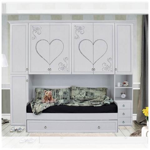 Cameretta a ponte branca bianco frassino con serigrafia a cuore glitterata la cameretta è composta da:2 letti con reti incluse.1 colonna con 2 ante.1 colonna con anta, 4 cassetti e vano a giorno con ripiano.2 armadi con ante dimensioni:ponte l 299 x p 57 x h 242 cm.colore bianco frassino con dettagli glitterati a forma di cuore.