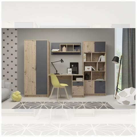 Parete attrezzata con scrivania gap system colore rovere e antracite il set contiene un armadio a due ante, scrivania, una mensola da muro e una libreria, indipendenti. Materiale: truciolare. Spessore 16 mm. Colore: rovere e antracite. Armadio composto da un piano superiore e 1 bastone appendiabiti. Scrivania composta da un vano aperto, cassetto, vano chiuso. Libreria composta da due vani chius...