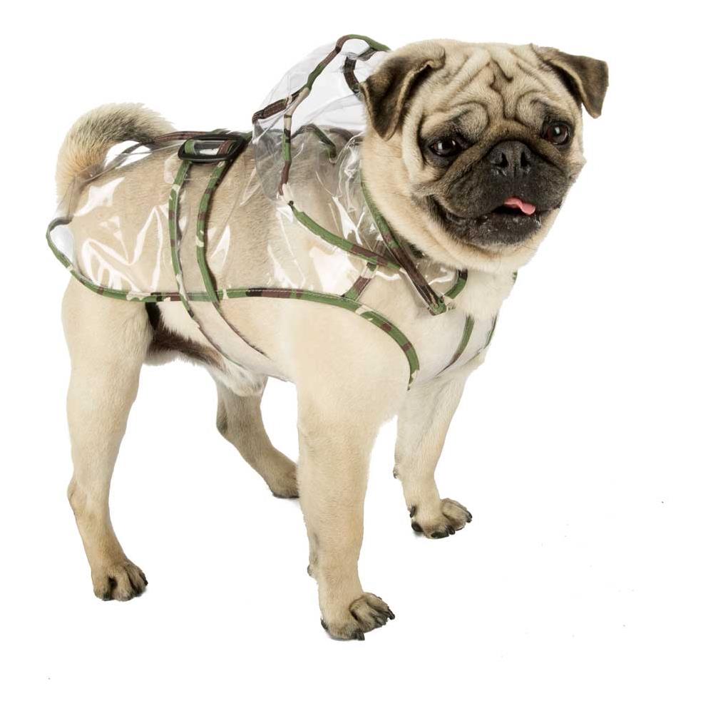Mantello impermeabile anti-vento adatto per portare fuori il cane in giornate piovose per evitare che si bagni, bordure in tessuto mimentico e dotato di collare incorporato regolabile.