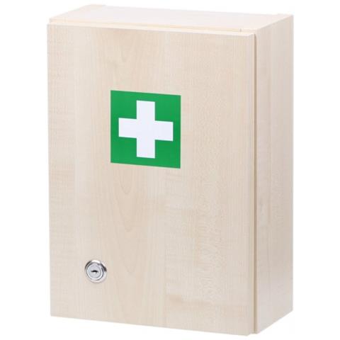 La cassetta di pronto soccorso vuota montata a parete serve a conservare il materiale di pronto soccorso per uffici, scuole, aziende e abitazioni. L'armadietto è chiudibile a chiave. L'armadietto dei medicinali è contrassegnato da una croce verde sulla porta. Materiale di montaggio incluso. Dati tecnici: materiale: laminato di legno. Colore: legno decorativo dimensioni : 33 cm x 23 cm x 12 cm.