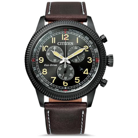 At2465-18e orologio citizen of collection 2020 uomo alimentazione solare display analogico funzioni cronografo impermeabilitã 10 atm water resistant materiale cassa acciaio colore cassa nero colore quadrante nero materiale cinturino pelle colore cinturino marrone.