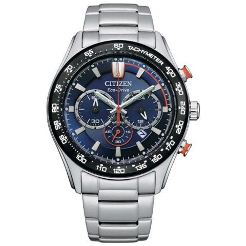 Orologio cronografo eco-drive da uomo di citizen della collezione aviator. Orologio con cassa e e bracciale in acciaio con lunetta nera e cassa con diametro di 43mm. Bracciale in acciao con chiusura a doppio pulsante. Orologio con quadrante nero con indici e sfere bianco luminol. La resistenza all'acqua è di 1o atm. Il movimento è eco drive con riserva di carica di 9 mesi. Orologio con vetro mi...