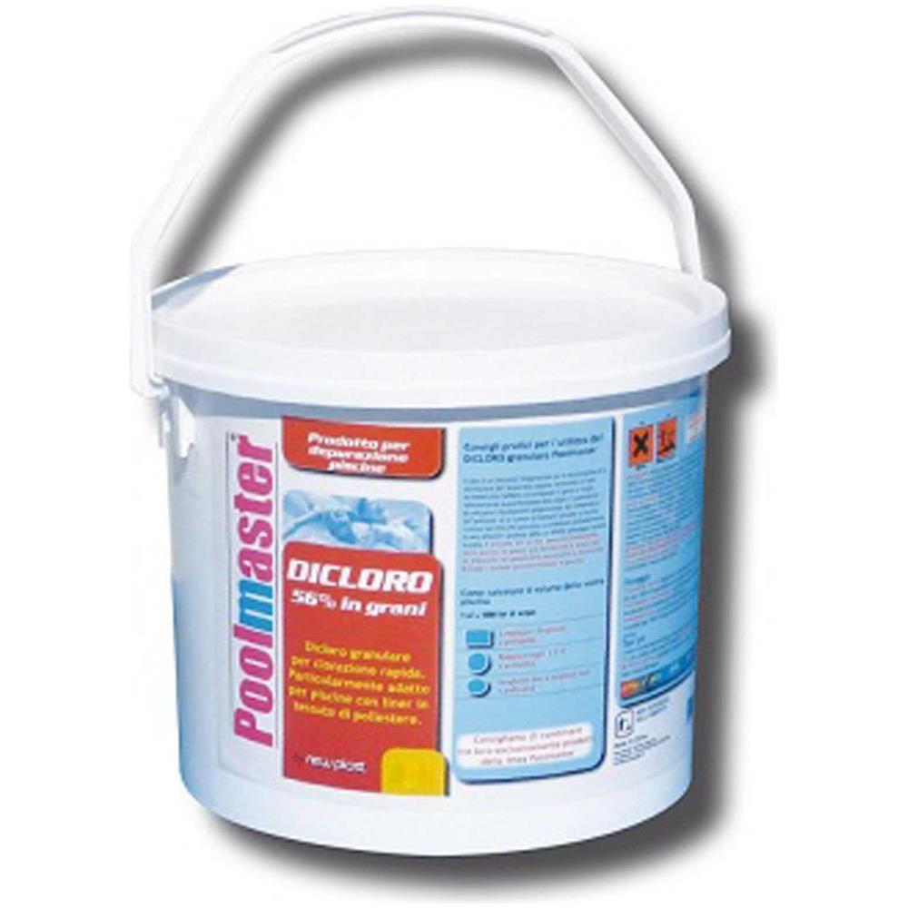 New Plast Poolmaster Dicloro Azione Rapida Scioglimento Confezione Secchio Kg 10 Granulare Cloro Grani Microperle Superclorazione Sanificante Schiarente Antialghe Anti Alghe Sterilizzazione Elimina Batteri Germi Funghi Dall'acqua Rallenta Formazione Alghe