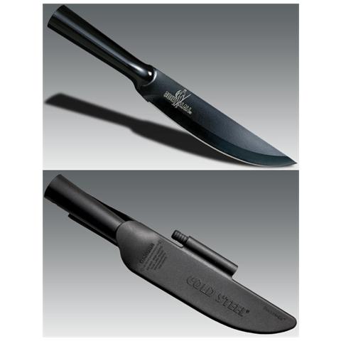 Coltello Cold Steel Bushman. Misura 31,1 centimetri complessivamente. Lama ricurva di 16,3 centimetri in alto acciaio al carbonio SK-5 temprato a 54 HRC con rivestimento nero. Manico vuoto adatto a contenere oggetti di sopravvivenza o estensioni atti a massimizzare la portata. Fodero nero Secure-Ex con clip e con foro passante. Acciarino compreso