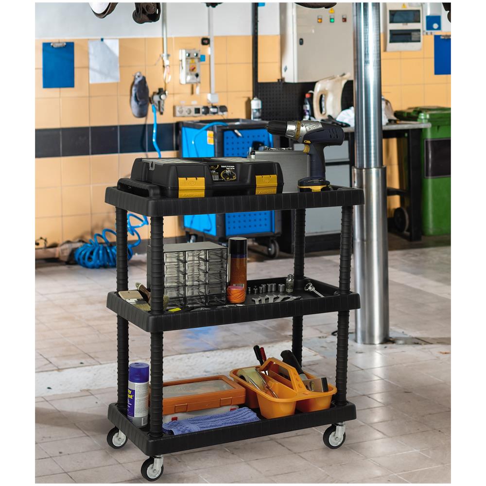 Carrello multiuso - carrello multiuso con tre ripiani su ruote, interamente di colore antracite. struttura e utilizzo - carrello mulituso strutturato su tre ripiani, di cui quello centrale regolabile in altezza - i bordi dei ripiani sono rialzati e permettono un comodo posizionamento degli oggetti evitando la loro caduta - dotato di maniglia in polipropilene e ruote in acciaio per facilitarne l...