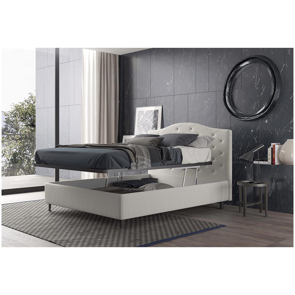 Letto matrimoniale contenitore, in tessuto colore grigio con testiera imbottita e struttura in legno e metallo, con rete a doghe. Letto dalle linee essenziali e moderne con testiera imbottita con impuntura che crea un elegante disegno geometrico. Ideale per chi dispone di poco spazio e vuole sfruttare anche lo spazio sottostante al letto, grazie all'ampio contenitore. Il meccanismo per alzare i...