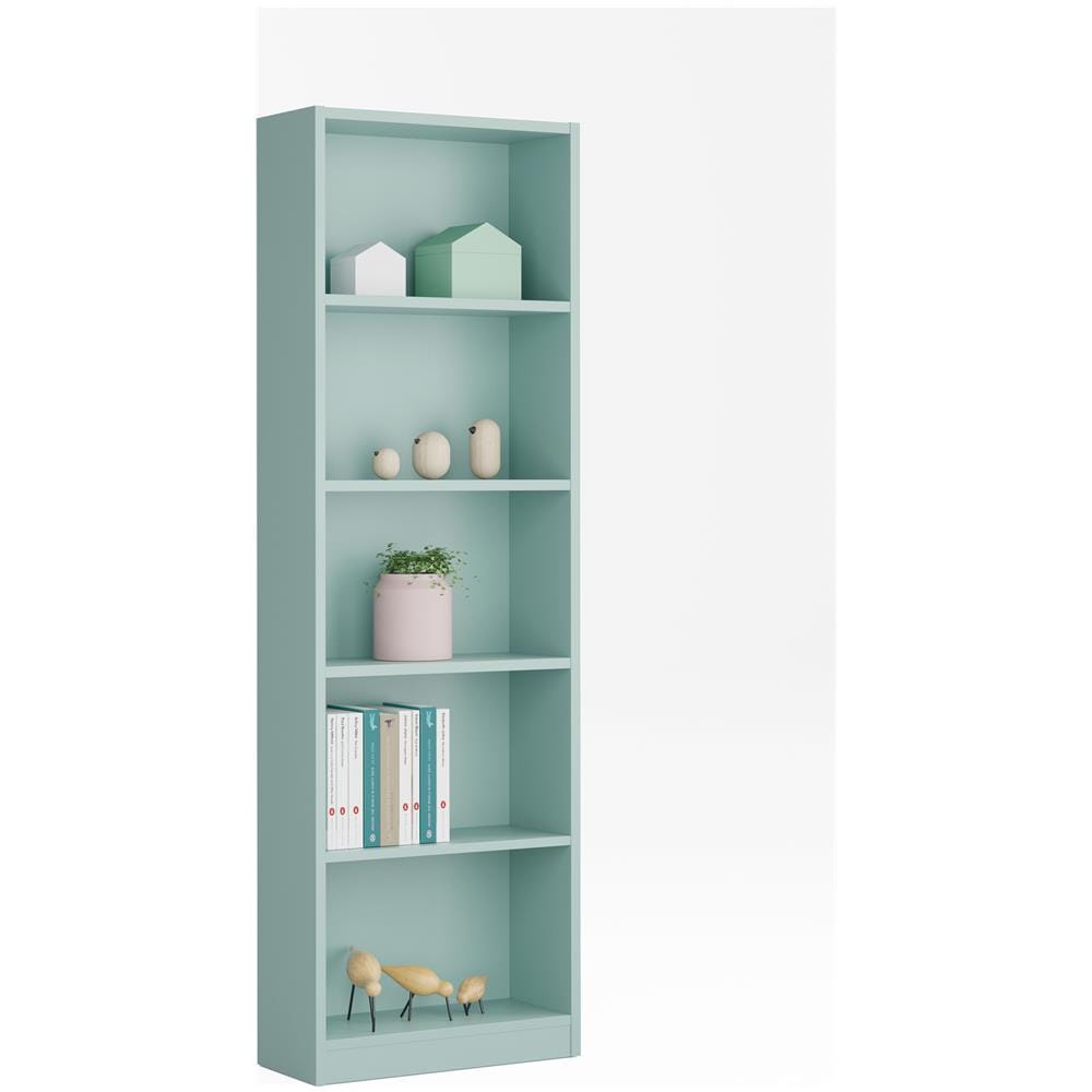 Libreria lineare a cinque ripiani di colore verde acqua. Perfetta per arredare la camera da letto di una bambina o di un maschietto, permette di riporre i libri in modo ordinato e con stile. I ripiani non sono regolabili in altezza. Costruita interamente in pannello truciolare melaminico risulta resistente a urti e graffi ed è durevole nel tempo. Misure 52 x 180 x 25 cm.