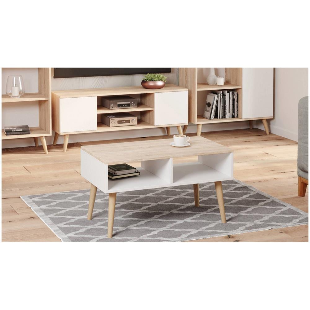 Tavolino da soggiorno - tavolino da caffè per soggiorno con due vani in stile scandi, interamente di colore bianco e rovere. struttura e utilizzo - questo tavolino in stile scandi presenta una struttura con piedini in legno di faggio e piano in pannello truciolare melaminico - strutturato con un piano e due piccoli vani contenitori è perfetto per essere utilizzato come porta riviste posizionato...
