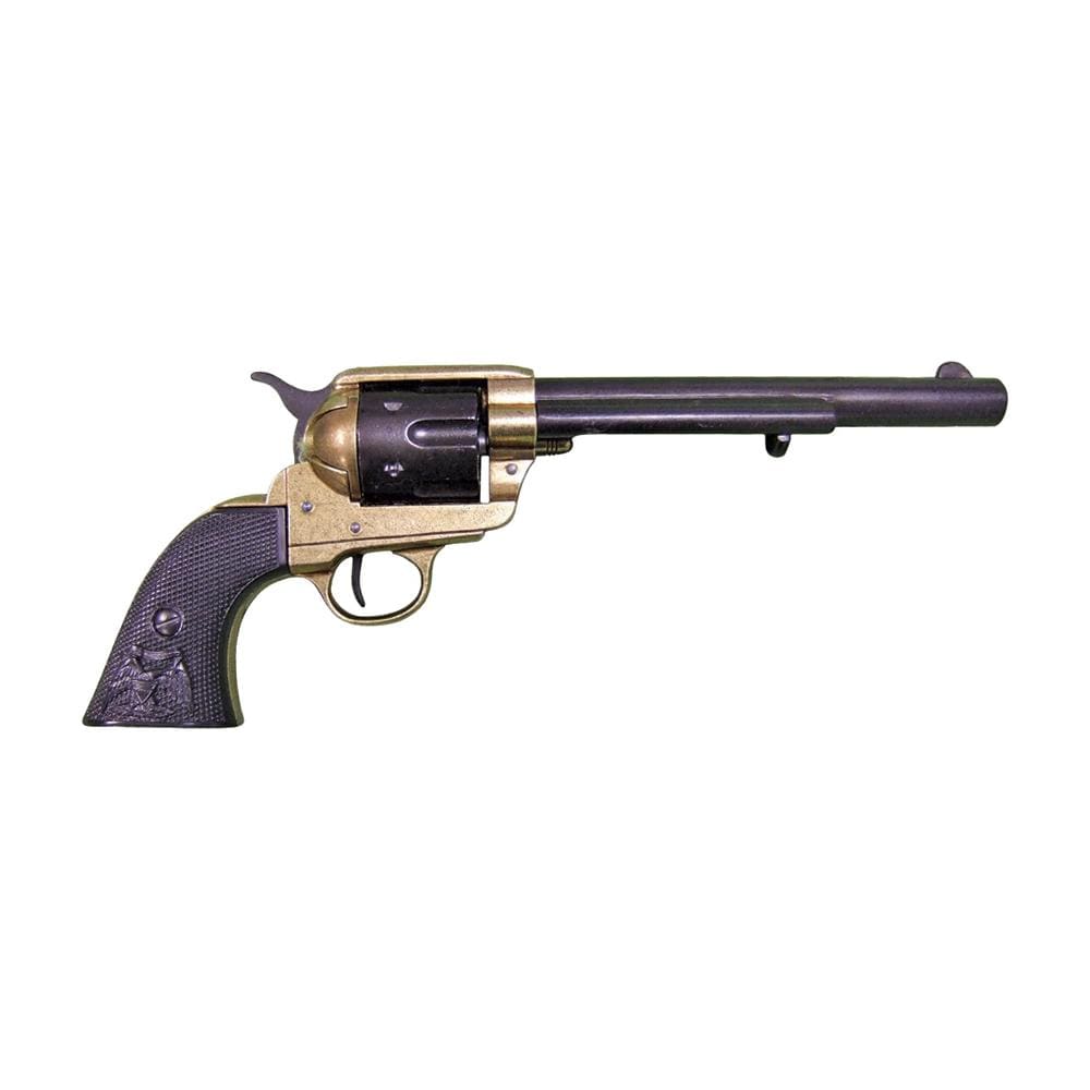 Pistola Denix. 45 Caliber Calvary Revolver Replica. Misura 33 centimetri in totale con 16,5 cm di canna. Finitura nera con particolari in ottone.