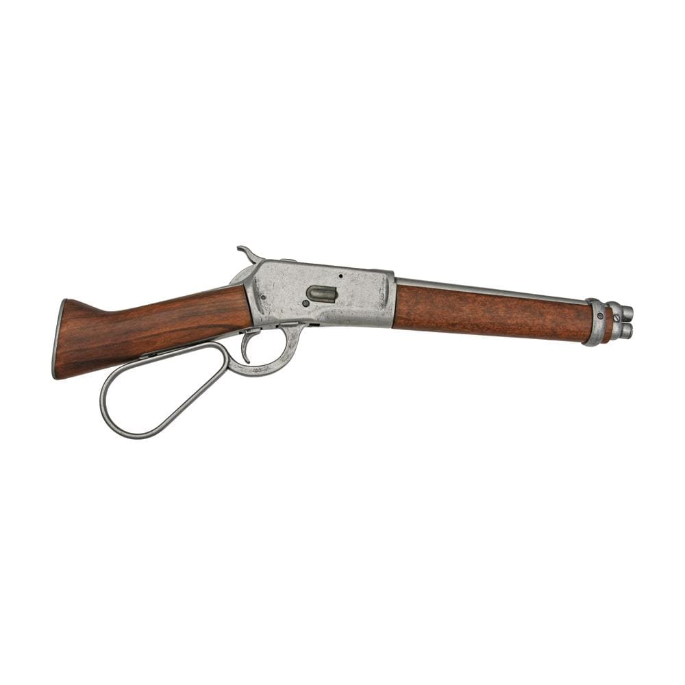 Replica pistola Denix Rifle. The Mare 's Leg Lever Action Rifle. Misura 49,9 centimetri complessivamente. Wood stock. Barile con finitura in argento antico. Questa è la versione ridotta della pistola che è resa famosa nella serie televisiva Wanted Dead or Alive. Non funzionante.