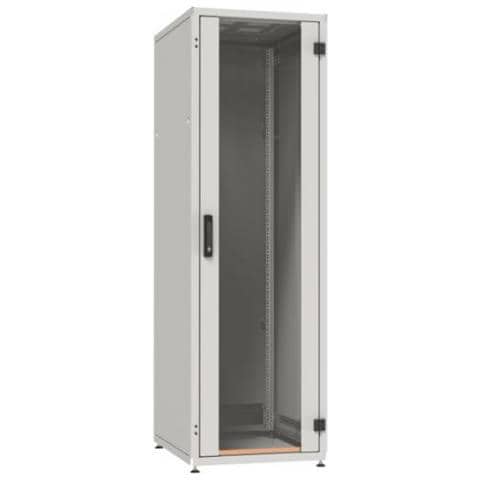 Armadio di rete da 19 pollici conforme a DIN41494. Cassa in lamiera d'acciaio con telaio avvitato, completamente premontata, autoventilata, smontabile. Montanti anteriori e posteriori da 4 x 19 pollici (2 anteriori, 2 posteriori), zincati, regolabili in profondità in modo continuo. Numerazione in senso antiorario delle unità di altezza sui profili da 19 pollici. Porta d'ingresso con finestra di...