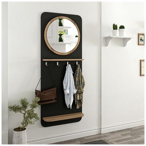 Mobile ingresso nero con specchio e appendiabiti slimingresso caratteristiche: materiale truciolare alta qualità. Spessore 18 mm. Rivestimento in pvc. Misure 60x15x150 h cm. (vedi dettagli in foto) si compone di: - 2 mensole color noce - 4 ganci appendiabiti. - specchio rotondo con cornice. Colore nero noce. Prodotto fornito smontato.