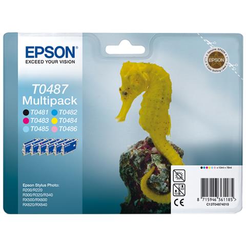 MultiPack T0487, contenente n. 6 cartucce : Nero (T048140), Ciano (T048240), Magenta (T048340), Giallo (T048440), Ciano-chiaro (T048540), Magenta-chiaro (T048650), in confezione blister RS. Compatibilità marca: Epson. Compatibilità: Stylus Photo R200, R220, R300, R320, R340, RX500, RX600, RX620, RX640. Tecnologia di stampa: Stampa inkjet. Tipo di inchiostroInchiostro a base di pigmento. Quantit...