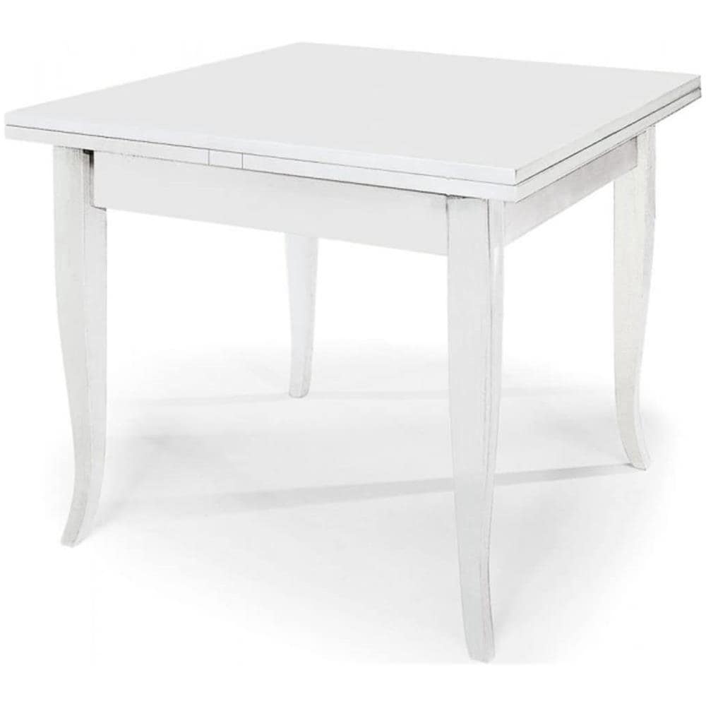 Tavolo in legno massello laccato bianco dotato di 2 allunghe da 35 cm. Dimensioni : 80x80 cm made in italy.
