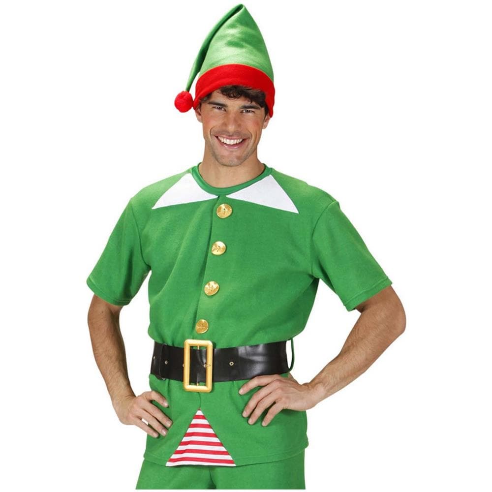 Questo completo da elfo per adulti si compone di t-shirt, cappello e cintura (pantaloni non inclusi) . La t-shirt è in realtà una finta camicia in tinta unita verde con inserto decorativo a righe rosse e bianche, quattro bei bottoni dorati ne simulano la chiusura mentre due triangoli bianchi fungono da colletto. Una cintura in simil cuoio nero con fibbia dorata la mantiene adesa in vita. Il ca...