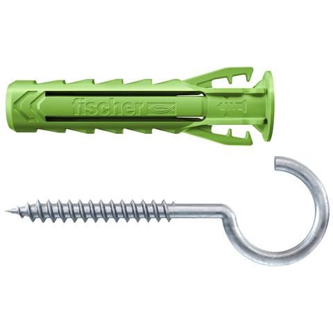 Fischer 567870. Tipo di prodotto: Kit di gancio a vite e tasselli a muro, Adatto per materiali: Calcestruzzo aerato autoclavato, Mattone, Cemento, Pannello in fibra di gesso, Muratura, Colore del prodotto: Verde. Diametro del foro del trapano: 6 mm, Profondità minima del foro del trapano: 4,5 cm, Diametro della vite (min): 4 mm. Quantità per pacco: 4 pz, Tipo di imballo: Blister, Tasselli inclu...
